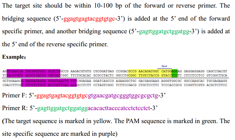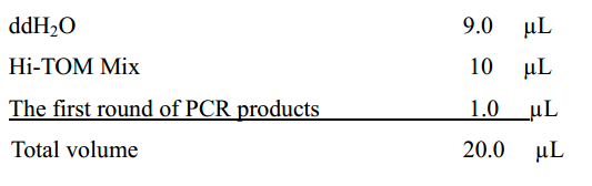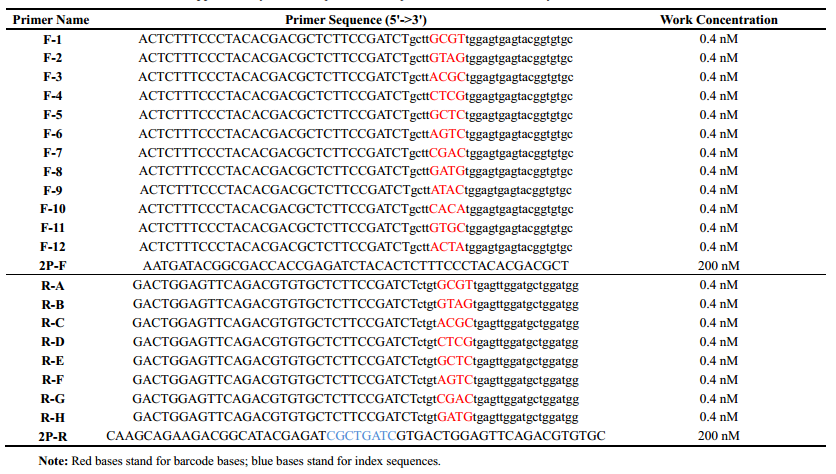 The second round of PCR products are mixed, and the mixture (200 µL) are detected and purified. The high-throughput sequencing (NGS) samples should with a concentration greater than 0.8 ng /µL, total amount more than 30 ng and volume more than 10ul. Samples of different target sites can be mixed together. For 960 PCR reactions, reliable results can be obtained with 1 Gb sequencing data.